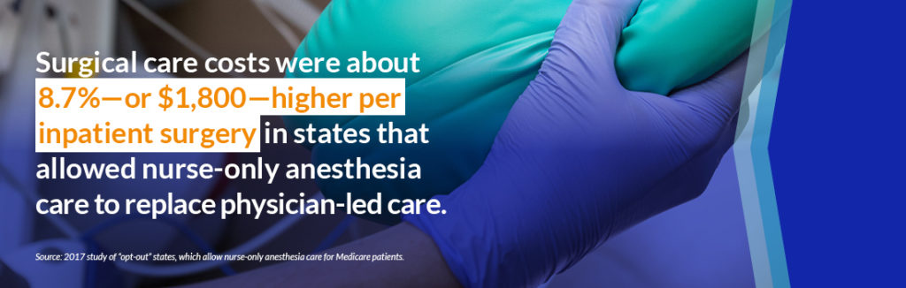 Nurse-only anesthesia care can lead to a higher number of hospitalizations after outpatient surgery. A 2012 study of more than 2 million patients receiving outpatient surgery found there was an 80% greater chance of their having “unexpected disposition” (including admission to the hospital) when anesthesia care was nurse-led instead of physician-led. These unexpected dispositions do not just represent poorer outcomes for patients; they also add hospital costs that can offset or exceed any “savings” from nurse-led care.